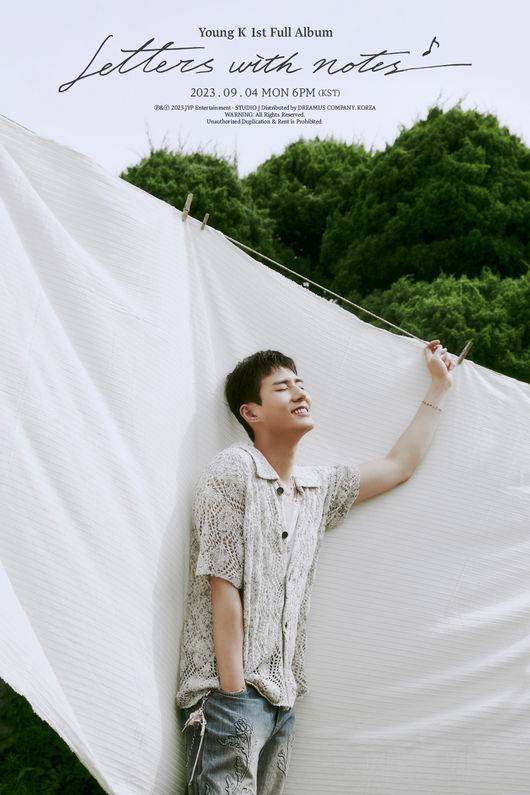 사진 속 Young K는 화창한 자연을 배경으로 자유를 만끽하고 있다. 울창한 숲 앞에 선 Young K의 싱그러운 미소가 행복감을 더하고 청재킷, 흰 셔츠 스타일링은 쿨하고 청량한 분위기를 배가했다. 특히 어느 곳에서든 기타를 손에 쥐고 있는 모습은 '육각형 아티스트' Young K의 음악적 매력을 강조해 다채로운 음을 붙여 완성한 편지인 첫 솔로 정규 음반 'Letters with notes'를 향한 기대감을 높였다.