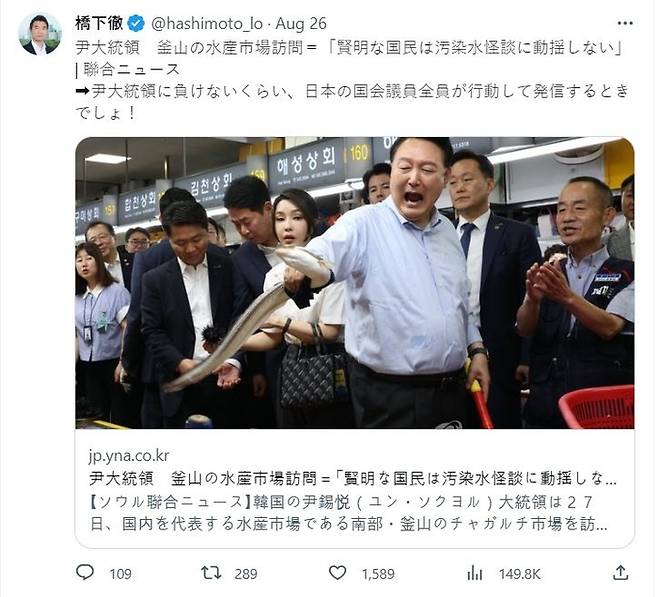 하시모토 도루 전 오사카부 지사는 26일 사회관계망서비스(SNS)에 풍평 피해에 대응하는 ‘롤 모델’로 윤 대통령을 거론했다. 하시모토 전 지사는 윤 대통령이 지난달 27일 부산 자갈치시장을 방문해 ‘우리 국민은 괴담에 흔들리지 않는다’고 언급했다는 기사를 인용하며 “윤 대통령 못지 않게 일본 국회의원 전원이 행동하고 발신할 때”라고 강조했다.
