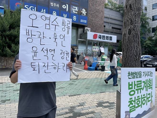 피켓을 들고 1인 시위를 하던 촛불행동 진영미 대표는 "오염수 방류 생중계 방송을 보고, 너무 충격적이고, 암담했다. 중국이나 대만, 홍콩 등 태평양 연안의 나라들에서는 일본 수산물 수입을 전면금지하겠다고 하는데, 우리나라 정부는 무엇을 하고 있는지 모르겠다. 오염수가 방류되는 상황을 보면서도 과학적으로 문제가 없다는 얘기만 하고, 변명만 하는 모습이 정말 화가 난다"라며 "대통령은 후손들이 어떻게 살 것인가에 대한 고민이 없나 보다. 지구와 우리나라를 지키기 위해서 나서지 않으면 정말 안 되겠다는 생각이 들어서 나오게 됐다"라고 말했다.
