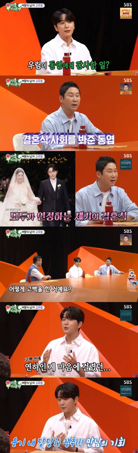 서장훈은 "고우림 씨가 동엽 형한테 감사한 마음이 있다고 한다"라며 궁금해했고, 고우림은 "결혼식 때 결혼식 사회를 봐주셨다. '미우새' 출연 제의를 받았을 때 동엽 형님이 계시다고 하니까 달려오고 싶어서"라며 고마움을 드러냈다.
