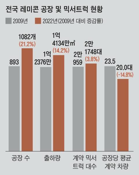 정부는 2024~2025년 건설 투자 전망이 부진하다는 이유로 앞으로 2년간 레미콘 믹서트럭 신규 등록을 허용하지 않기로 했다. 그러나 레미콘 업체들은 “현실을 너무 모르는 결정”이라고 반발한다. 배조웅 한국레미콘공업협동조합연합회 회장은 “연평균으로 보면 레미콘 차량이 부족하지 않은 것처럼 보이지만 조업이 몰리는 시기엔 턱없이 부족하다”며 “연중 수요가 가장 많은 시기에 맞춰 최대치를 잡고 지역 간 수요 차이도 감안해야 한다”고 지적했다.