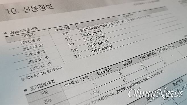 | ▲ (주)더굿하우스 신용분석보고서 중 'Watch 등급 이력'. 지난 7월 3일부터 '대표자 신용변동'으로 주의 등급으로 평가됐음을 확인할 수 있다. |