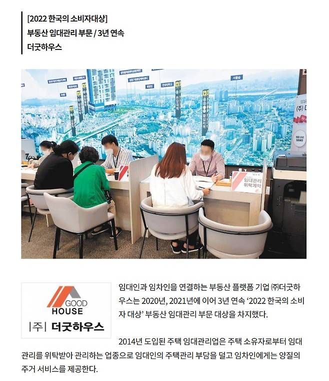 "국토교통부가 발간한 2020년 주택업무편람에 따르면 2019년 6월 기준 주택임대관리업에 정식으로 등록돼 있는 업체는 전국 총 341개로 그중 부동산 임대관리서비스 부문 4관왕을 달성한 업체는 (주)더굿하우스가 유일하다." (2020년 11월 9일 자 중앙일보)