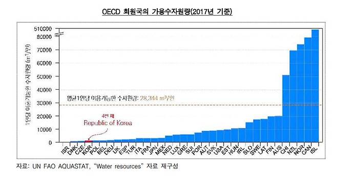 사실 우리나라는 원래 1인당 사용할 수 있는 물의 양이 세계 평균치의 13분의 1 수준이자, OECD 회원국 중에선 4번째로 적습니다. 그런데 기후변화까지 덮치면서 미래엔 물 부족 정도가 더 심해질 우려가 있는 겁니다.