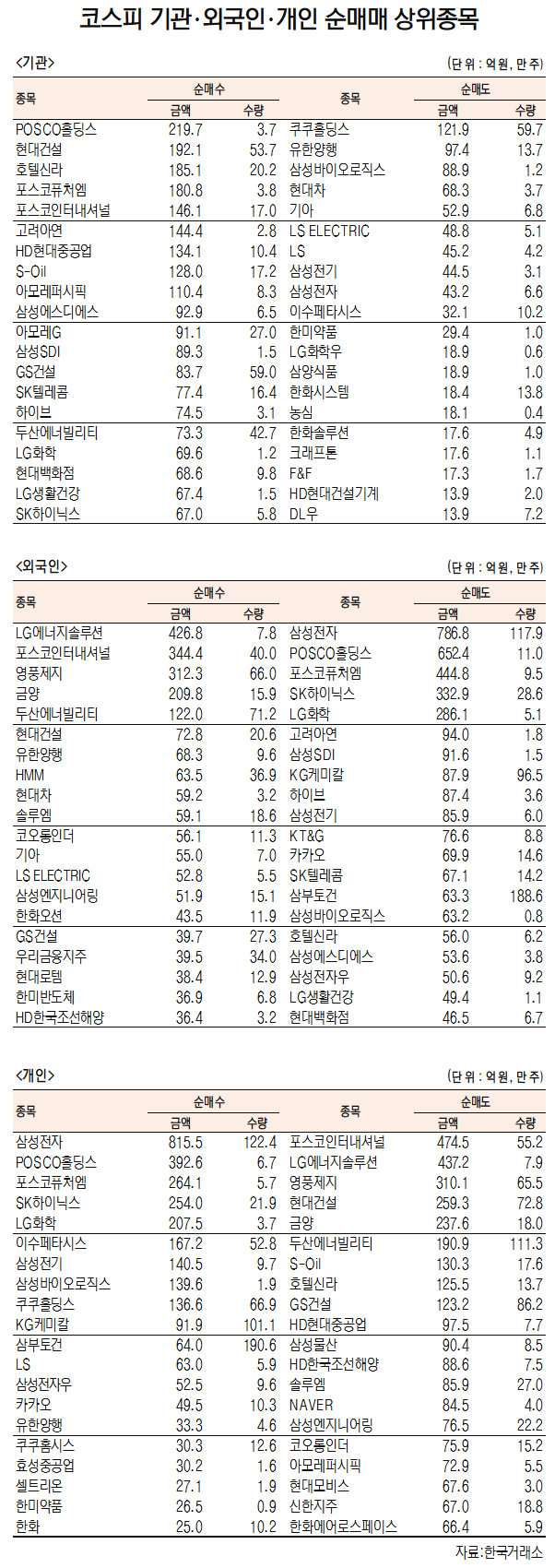 [데이터로 보는 증시]POSCO홀딩스·LG엔솔, 기관·외국인 코스피 순매수 1위(8월 28일-최종치)