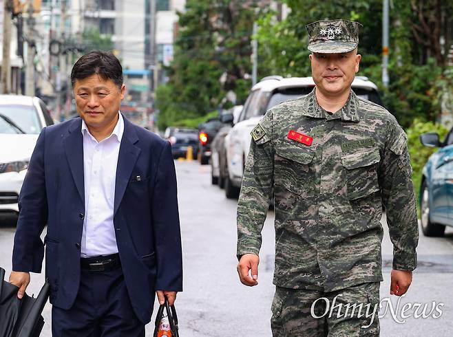 | ▲ 박정훈 해병대 전 수사단장이 28일 오후 항명 사건을 수사 중인 서울 용산구 국방부 검찰단에 출석 하기 위해 김정민 변호사와 함께 도착하고 있다. 박 전 수사단장은 지난 7월 경북 예천에서 집중호우 실종자 수색 중 숨진 해병대 채 모 상병 관련 수사 결과를 경찰에 이첩하지 말고 보류하라는 국방부 장관의 지시를 따르지 않은 혐의(군형법상 항명)로 입건됐다. |