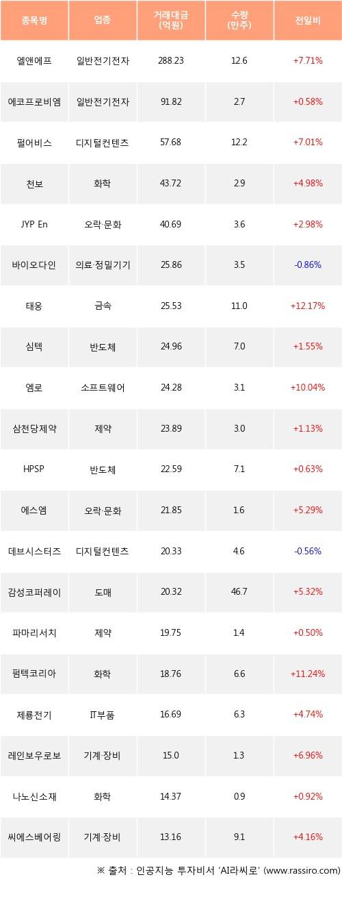 기관 투자자의 순매수 상위 20개 종목은 엘앤에프, 에코프로비엠, 펄어비스, 천보, JYP Ent., 바이오다인, 태웅, 심텍, 엠로, 삼천당제약등이다.