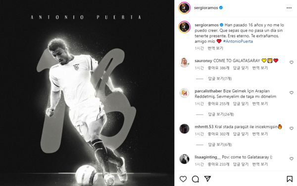 라모스는 28일(이하 한국시간) 자신의 SNS를 통해 “16년이나 지났는데 믿기지가 않는다. 너 없이는 하루도 내 앞에서 지나가지 않는다는 걸 알잖아. 너는 영원하고 우리는 네가 그립다. 친구야”라는 글과 함께 안토니오 푸에르타를 추모했다.