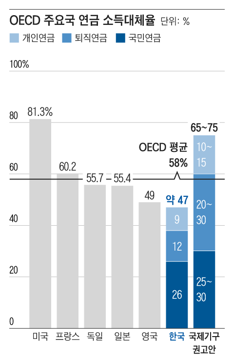 윤석명 한국보건사회연구원 연구위원은 “국민연금의 소득대체율(42.5%)은 경제협력개발기구(OECD)의 공적연금 평균 소득대체율과 엇비슷하거나 약간 높은 수준”이라면서 “하지만 국민연금 보험요율은 9%인데 반해, OECD 평균 요율은 20%에 달해 격차가 크다”고 말했다. 다른 나라들은 소득대체율 40%를 달성하기 위해 국민들이 보험료를 훨씬 더 많이 내고 있다는 얘기다. 한편, 정부의 연금개혁 초안 격인 국민연금 재정계산위원회의 보고서는 다음 주 공개될 예정이다.