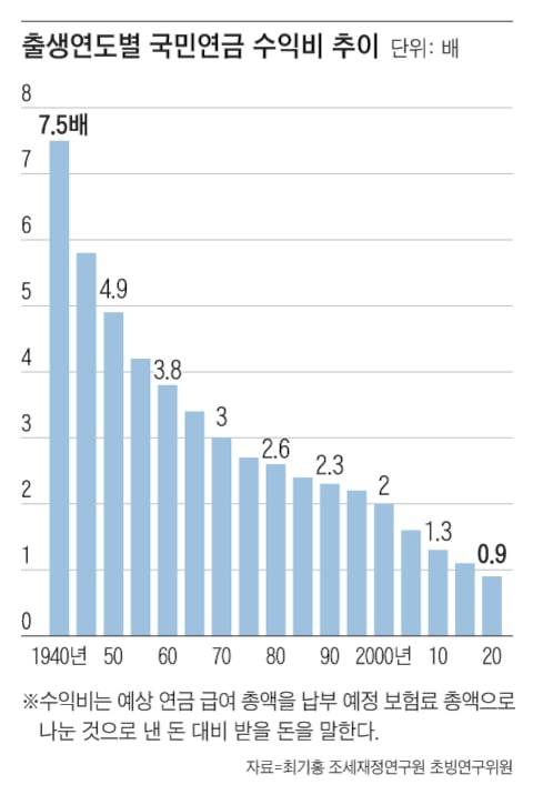 김동엽 미래에셋 투자와연금센터 상무는 “공무원연금은 30년 정도 가입하면 평균 248만원 정도 받는데 보험료율이 월 소득의 18%로 국민연금의 2배”라며 “그렇게 보면 30년 최고참 세대의 연금액인 157만원은 적지 않은 금액이지만 소득대체율이 낮아지고 있어서 미래 세대는 30년 가입해도 적게 받을 가능성이 높다”고 예상했다. 연령대로 나눠서 보면, 현 20~30대가 나중에 받을 국민연금의 실질 가치는 훨씬 적을 수 있다는 것이다.