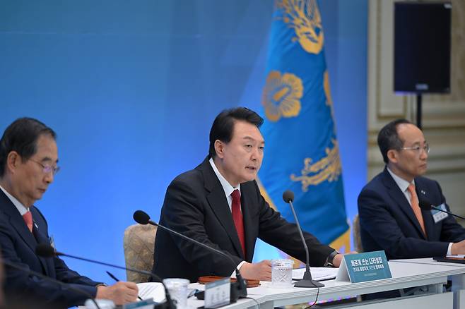 | ▲ 윤석열 대통령이 6월 28일 오후 서울 종로구 청와대 영빈관에서 중기재정운용 및 내년도 예산 편성 방향을 논의하기 위해 2023년 국가재정전략회의를 주재하고 있다. 왼쪽부터 한덕수 국무총리, 윤 대통령, 추경호 경제부총리 겸 기획재정부 장관. |