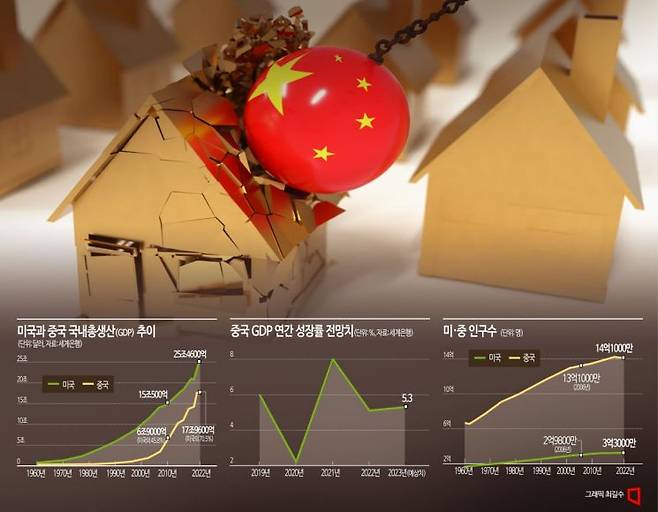 2010년 미국 최대 투자은행 골드만삭스는 중국의 국내총생산(GDP) 규모가 미국을 추월하는 시점이 2020년대 후반, 빠르면 2019년이 될 것이라고 예측했다. 당초 전망(2040년대 초반)에서 무려 20년가량 추월 시점을 앞당긴 전망이었다. 당시 중국의 GDP 규모는 미국의 45%에 불과했지만, 중국의 GDP 성장률은 10%를 웃돌던 고도성장 시대였다. 다른 예측 기관들도 수십년 안에 양적으로 중국 경제가 미국에 버금가거나 미국을 역전할 수 있다는 관측을 앞다퉈 내놨다. 실제로 지난해 기준 중국의 GDP는 17조9600억달러(약 2경3790조원)로, 미국(25조4600억달러)의 70.5% 수준까지 치고 올라오기도 했다.
