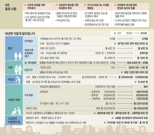 ‘건전재정’ 기조를 내건 윤석열 정부가 “허리띠를 졸라매도 쓸 데는 쓴다”는 원칙하에 사회적 약자를 위해서는 곳간을 풀겠다는 방침을 확고히 한 것으로 평가된다.