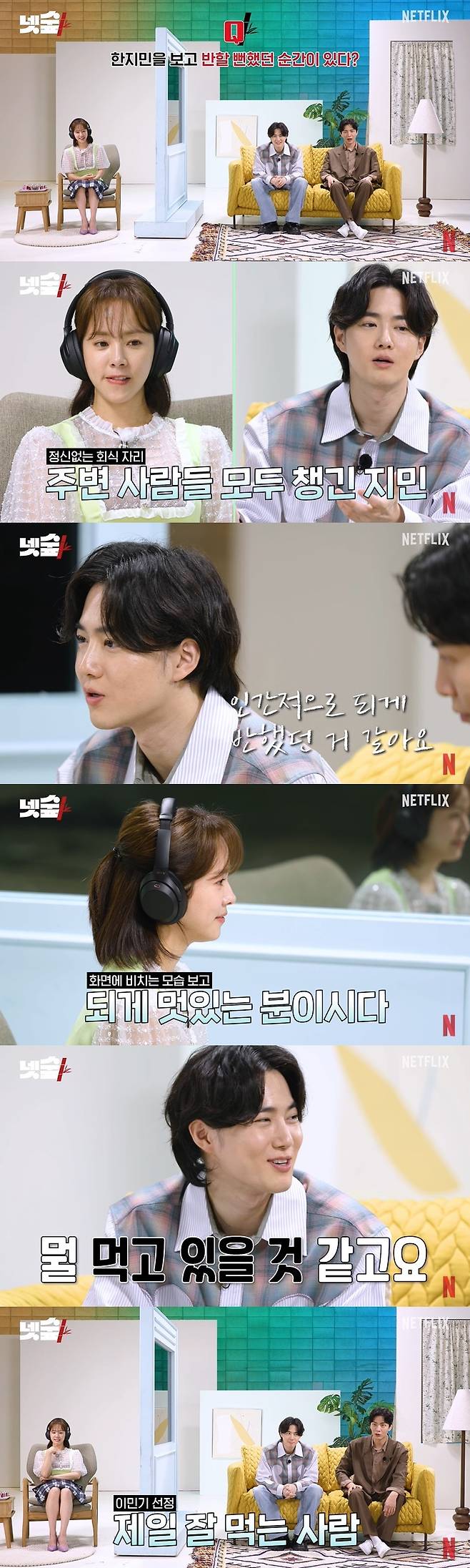 이민기는 "제가 아는 사람 중에 제일 잘 먹는다. 잘, 많이, 여러 가지를 먹는다. 회식하다가 감자탕에 밥 볶았는데 그거 안 먹었다고 혼났다. 분명 고깃집에서 밥을 먹고 왔는데"라며 한지민의 식탐을 폭로해 웃음을 안겼다.