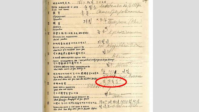 지난 2021년 홍 장군 유해봉환 당시 처음 화제가 됐던 이 서류는 1922년 홍범도 장군이 모스크바에서 열린 극동민족대회에 참석하기 위해 소련에 입국하며 쓴 서류다.