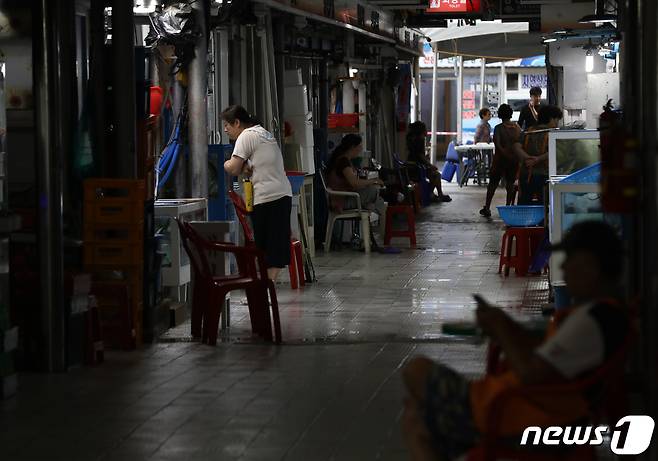 (부산=뉴스1) 윤일지 기자 = 일본 후쿠시마 원전 방사능 오염수 방류로 수산물 소비 위축이 우려되는 가운데 29일 부산 강서구 명지시장활어센터에서 상인들이 손님을 기다리고 있다.