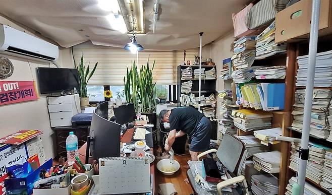 | ▲ 최은순씨 일가와 20년 동안 송사를 이어가고 있는 정대택씨 사무실의 모습이다. 이 날 폭우가 쏟아졌고 오피스텔 천장에서 비가 새 정씨가 바닥을 닦고 있다. |