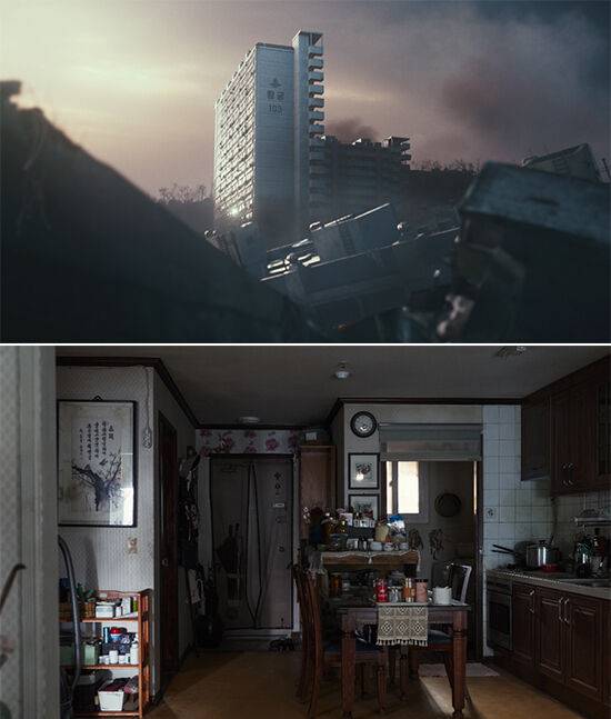 A. 황궁아파트는 큰 산에 붙어있는 아파트다. 반대쪽에서 지진파가 몰려왔는데 산에 부딪히면서 그 아파트만 남아있고 나머지는 쓸려간 설정을 부여했다. 그 맥락이 그림 하나로 설득이 돼야 해서 CG를 잘 만들어달라고 부탁했다. 아파트는 3층까지만 실제로 짓고 나머지는 CG로 처리했다.