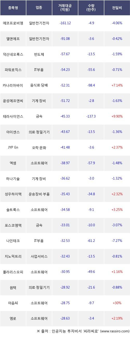외국인 투자자의 순매도 상위 20개 종목은 에코프로비엠, 엘앤에프, 덕산네오룩스, 파워로직스, 카나리아바이오, 윤성에프앤씨, 테라사이언스, 아이센스, JYP Ent., 엑셈등이다.