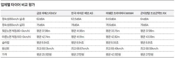 제동거리 비교도 했다. 시속 80㎞로 젖은 노면을 달리며 시험한 결과에서는 미쉐린 프라이머시 MXM4가 가장 짧은 평균 33m대를 기록했다. 전기차 전용 타이어 중에서는 금호 마제스티 9 EV가 가장 짧은 평균 37m대의 제동거리를 냈다. 이후 한국과 콘티넨탈이 40m대를 기록했다.