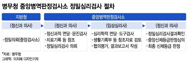 병무청 심리검사는 과거 인성검사 후 정신건강의학과 의사가 검사하는 2단계 절차에서 심리검사, 임상심리사 검사, 정신건강의학과의사 검사의 3단계 검사를 거쳐 최근 정밀심리검사를 추가한 4단계로 실시되고 있다.