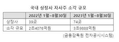 30일 금융감독원 전자공시시스템에 따르면 올해 자사주 소각을 공시한 국내 상장사는 74곳, 소각 규모는 3조9888억원이다. 지난해 같은 기간에는 39곳, 2조4076억원이었다. 기업 수는 1.9배, 소각금액은 1.7배 각각 증가한 셈이다.
