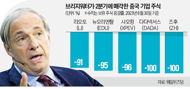세계 최대 헤지펀드인 브리지워터가 미국 증권거래위원회(SEC)에 지난 15일 제출한 주식 보유 현황 공시(13F)에 따르면 이 회사는 2분기에만 보유 중국 주식 가운데 3분의 1가량을 매도했다.