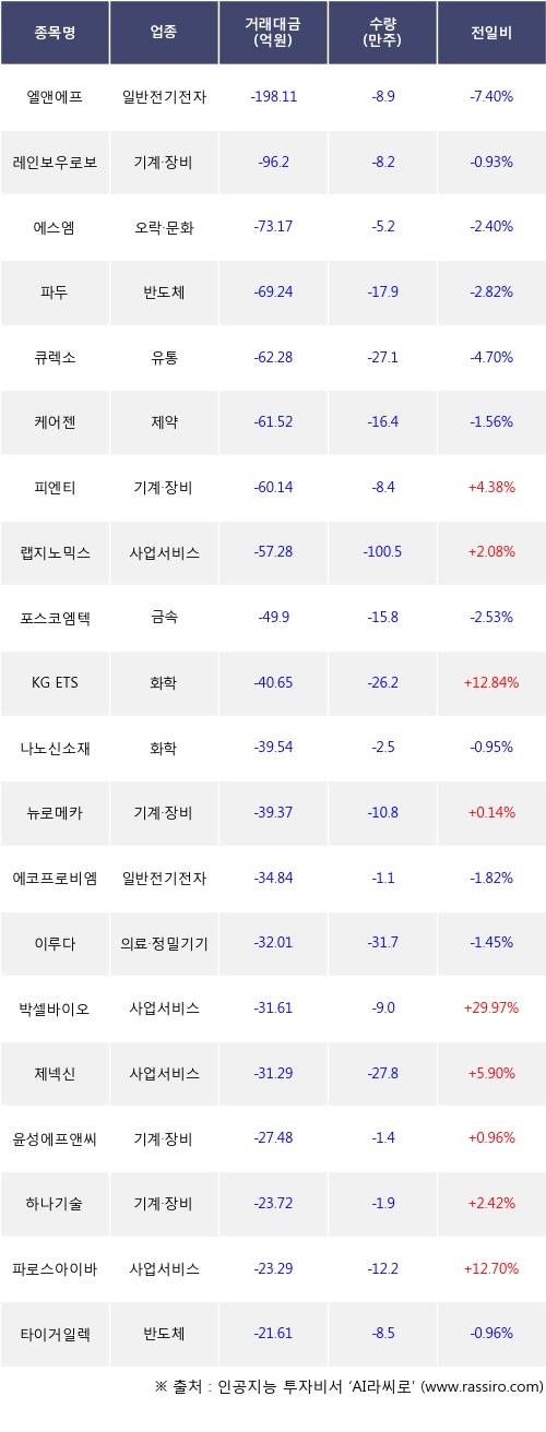 외국인 투자자의 순매도 상위 20개 종목은 엘앤에프, 레인보우로보틱스, 에스엠, 파두, 큐렉소, 케어젠, 피엔티, 랩지노믹스, 포스코엠텍, KG ETS등이다.