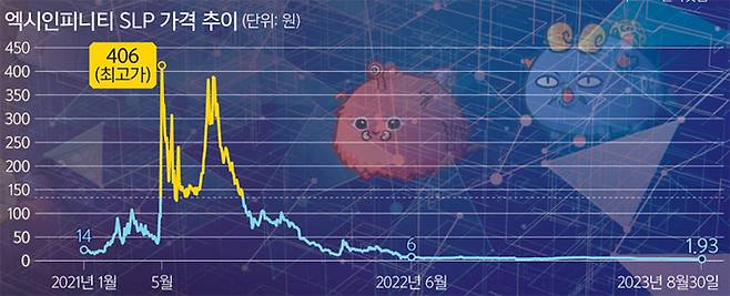 그러나 달콤한 꿈이 깨지기까지 그리 오래 걸리지 않았다. 끝없이 오를 것만 같았던 SLP 가격이 2021년 5월을 정점으로 구멍 난 낙하산처럼 수직 낙하했기 때문이다. 가상자산 거래소 코인베이스에 따르면 2021년 5월2일 406원이었던 SLP 가격은 일주일 만에 230원으로 반토막났고, 한 달 뒤에는 179원으로 쪼그라들었다. 2022년 5월부터는 6원대에 진입했고, 현재는 1.9원까지 곤두박질쳤다. 2년 만에 SLP의 가격이 최고가의 0.2% 수준으로 떨어져, 사실상 휴지조각이 된 것이다.