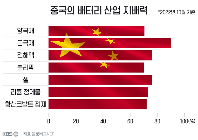 아래는 블룸버그가 정리한 중국 배터리 산업이 지배하는 광물들과 그 점유율이다. 우리 배터리 산업은 바로 이 중국 배터리 산업이 지배하는 광물과 소재에 의존하고 있다. (다만 한국에서 생산된 부가가치의 비율이 IRA 규정을 충족하기 때문에 한국산 인정을 받는다.) 다시 말하면 한국이 미국으로부터 보조금을 받는 전기차 배터리도 실은 여전히 대부분 중국 광물과 소재 등 중간재에 의존하고 있다.