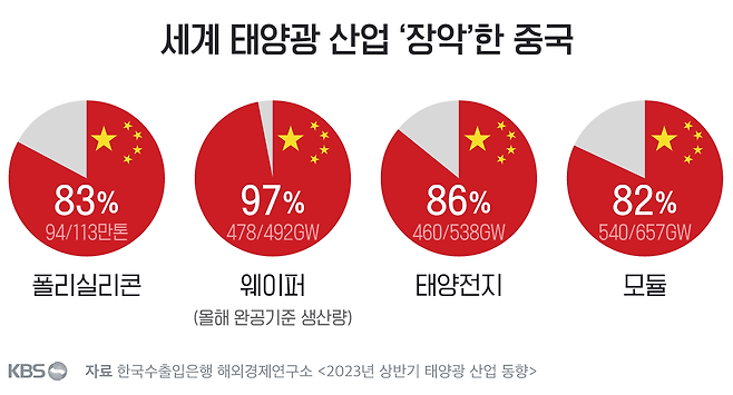 한국수출입은행 해외경제연구소가 내놓은 태양광 산업 동향(2023년 상반기)을 보면, 중국은 "세계 태양광 산업을 장악"했으며 "현재는 경쟁자가 없는" 상황이다. 자체 생산기술을 확보하고 있는데다, 규모의 경제를 통해 원가경쟁력을 확보했다. 기술적으로 앞서고, 광물도 선점했는데, 효율적 물류망까지 이미 갖추고 있다. 점유율은 경악할 만큼 높다.