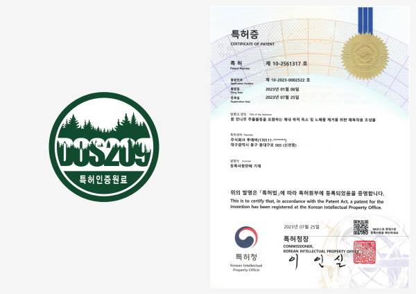 이번에 취득한 특허의 공식명칭은 ‘DOS209’로, 3가지 식물(드레곤 헤드 Dragon Head, 오크라 Okra, 흰 전나무 Silver fir)에서 추출한 식물성 천연물질을 오랜 실험과 테스트를 통해 최적의 배합비로 완성했다.