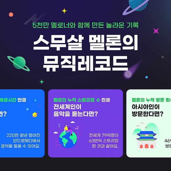 현재까지 멜론의 누적 스트리밍 수는 5001억회로 이는 전 세계 인구 79억명이 모두 63번씩 스트리밍한 것과 같다. 누적 재생시간은 총 1조 5000억분이고, 누적 방문 횟수(PV)는 2035억회로 전 아시아 인구 46억명이 각각 45번씩 방문한 것과 맞먹는다.