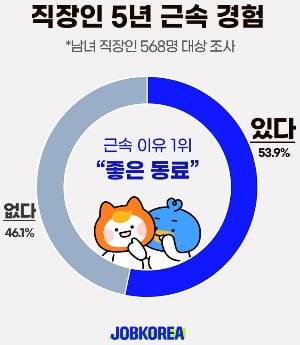 한 회사를 오래 다니는 직장인들은 근속 이유로 연봉, 근무환경 등의 다른 조건보다 '좋은 동료'를 첫 손에 꼽았다.