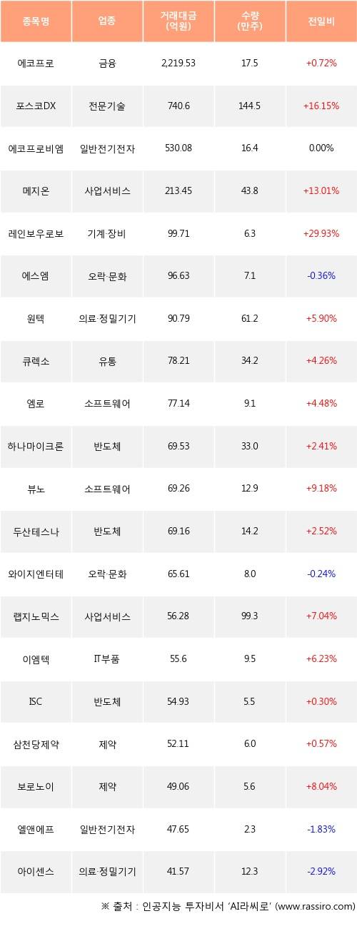 외국인 투자자의 순매수 상위 20개 종목은 에코프로, 포스코DX, 에코프로비엠, 메지온, 레인보우로보틱스, 에스엠, 원텍, 큐렉소, 엠로, 하나마이크론등이다.