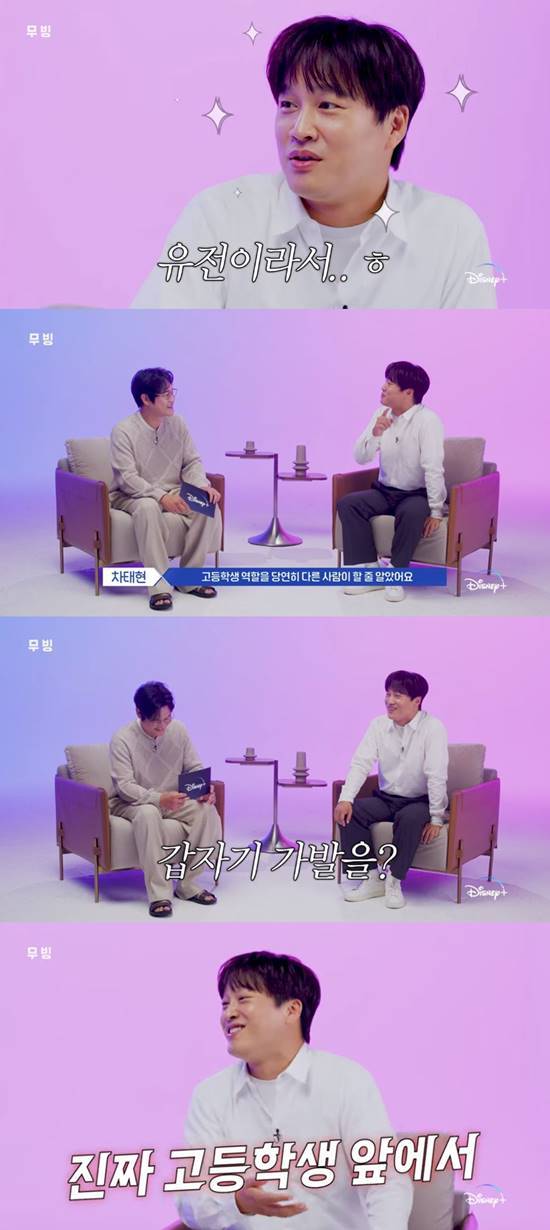 더불어 차태현은 '무빙'에서 고등학생 역할을 다른 아역이 연기할 줄 알았다며 일화를 전했다. 그는 "너무 당연했다. 다들 그렇게 하니까. 근데 갑자기 가발을 주더라. 나는 번개맨 가발만 있으면 되는데 하나를 더 맞춰야 한다더라"라며 당혹스러웠던 당시를 회상했다.