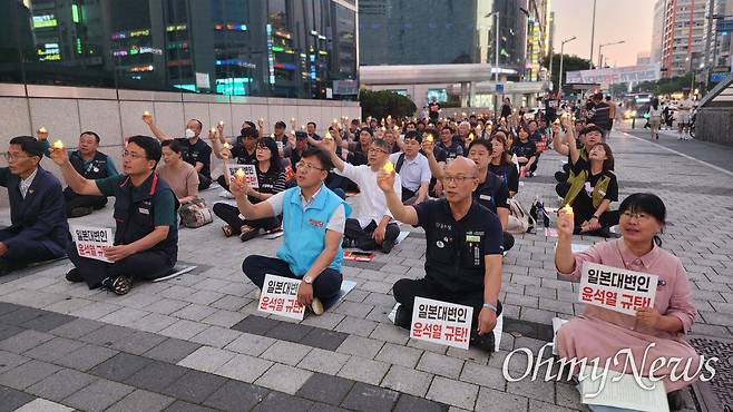 이에 촛불과 함께 '핵폐수 해양 투기 중단', '일본 대변인 윤석열 OUT!'이라는 글귀가 쓰인 피켓을 든 100여명의 시민들은 크게 환호하면서 "인류재앙 부르는 핵폐수 해양투기 중단하라"는 구호를 외쳤다.
