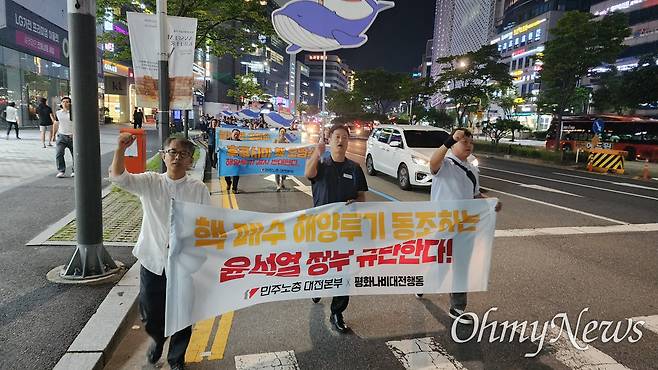 | ▲ 평화나비대전행동과 민주노총대전본부은 31일 저녁 대전 서구 둔산동 은하수네거리에서 개최한 '일본 핵폐수 해양투기 중단! 일본정부 동조하는 윤석열정부 규탄 대전시민 촛불행동’을 개최했다. 사진은 거리행진 장면. |