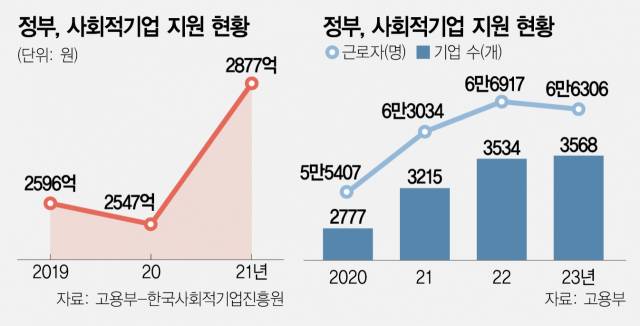 사회적기업은 민간기업과 공공서비스를 결합한 형태다. 정부의 적극적 육성 지원 덕분에 2007년 55곳이던 사회적기업은 올해 3월 기준 3568개로 17년 만에 약 65배 늘었다. 사회적기업은 일하는 근로자 중 약 60%가 고령자, 장애인으로 취약계층의 일자리 역할을 했다.