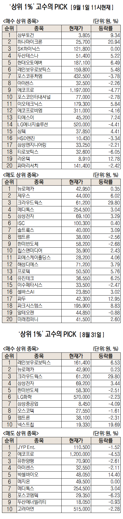 미래에셋증권은 자사 고객 중에서 지난 1개월간 수익률 상위 1% 투자자들의 매매 종목을 집계해 실시간·전일·최근 5일 기준으로 모바일트레이딩시스템(MTS)상에서 공개하고 있다. 이 통계 데이터는 미래에셋증권의 의견과 무관한 단순 정보 안내이며, 각각의 투자자 개인에게 맞는 투자 또는 수익 달성을 보장하지 않는다. 또 테마주 관련종목은 이상급등락 가능성이 있으므로 유의해야 한다.