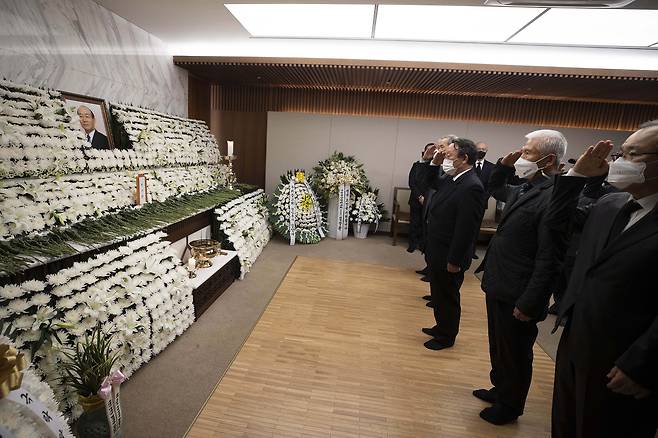 | ▲ 지난 2021년 11월 25일 오전 서울 서대문구 신촌 세브란스병원 장례식장에 마련된 전두환 전 대통령 빈소에서 육사 총동창회 회원들이 거수경례를 하고 있다. |