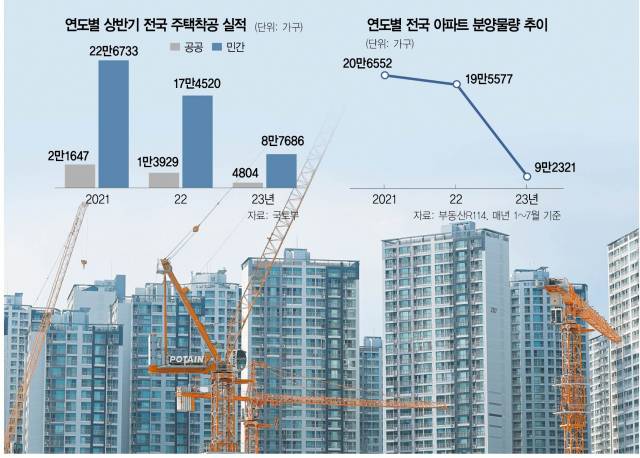 부동산 시장이 침체기임에도 불구하고 정부가 이달 부동산 공급 대책을 내놓는 것은 올해 들어 주택 공급 선행지표가 부진해 2~3년 후 공급난이 닥칠 우려가 커지고 있기 때문이다. 올 1~7월 전국의 주택 인허가 및 착공 물량은 전년 동기보다 각각 30%, 54%가량 감소했다. 통상 주택은 착공 2~3년 후 공급이 이뤄진다는 점을 고려하면 2025년부터 본격적으로 공급난이 불거질 수 있는 셈이다. 원희룡 국토교통부 장관도 이를 예의 주시하고 있다며 최근 들어 공급 시그널을 거듭 강조했다.