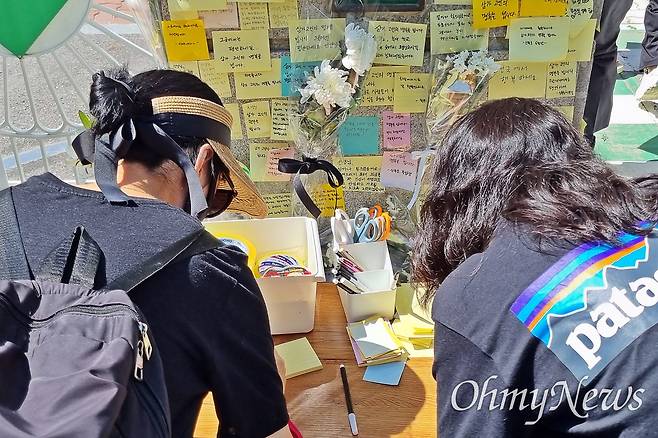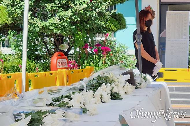 | ▲ 서울 양천구 A초등학교 교사의 사망(8월 31일) 소식이 1일 오후 알려진 가운데, 다음 날인 2일 오전 해당 학교 앞에 수많은 추모 화환과 추모객의 편지가 쌓여 가고 있다. 고인의 동료 교사가 학교 앞에 마련된 분향소를 지키고 있다. |