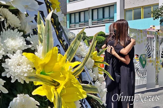 | ▲ 서울 양천구 A초등학교 교사의 사망(8월 31일) 소식이 1일 오후 알려진 가운데, 다음 날인 2일 오전 해당 학교 앞에 수많은 추모 화환과 추모객의 편지가 쌓여 가고 있다. 고인을 추모하기 위해 온 교사들이 껴안고 눈물을 흘리고 있다. |