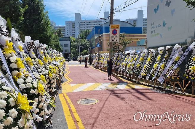 | ▲ 서울 양천구 A초등학교 교사의 사망(8월 31일) 소식이 1일 오후 알려진 가운데, 다음 날인 2일 오전 해당 학교 앞에 수많은 추모 화환과 추모객의 편지가 쌓여 가고 있다. |