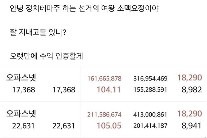 한동훈 테마주인 오파스넷으로 3억7000만원 수익을 인증한 한 여성은 "정치 테마주는 일정한 패턴이 있어 다른 종목보다 쉬운 것 같다"고 말했습니다.