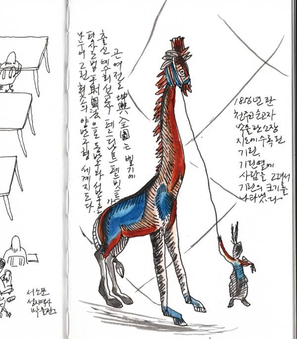 | ▲ 곤여전도에 나오는 기린을 그렸다. 기린과 사람이 같이 그려져 있어서 기린이 얼마나 큰지 짐작할 수 있게 그려져 있다. |