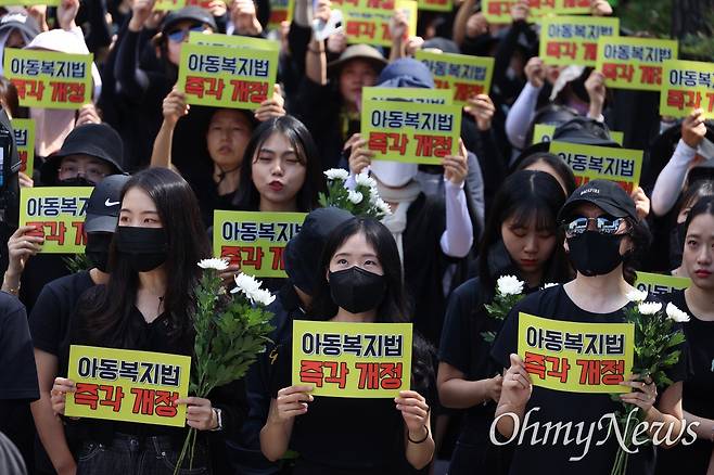| ▲ 전국에서 모인 교사들이 2일 오후 2시 서울 영등포구 국회의사당 앞에서 열린 '50만 교원 총궐기 추모집회'에 참석해 국화와 "아동복지법 즉각 개정"이라고 적힌 피켓을 들고 있다. |