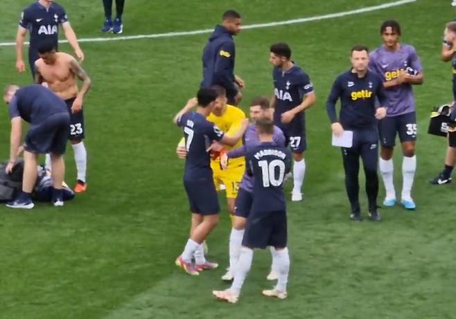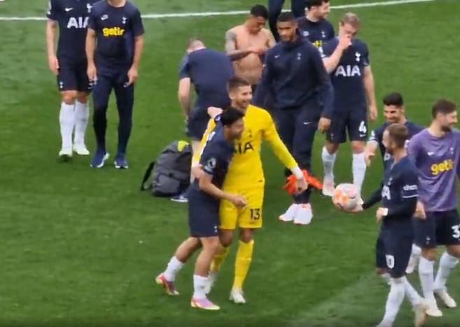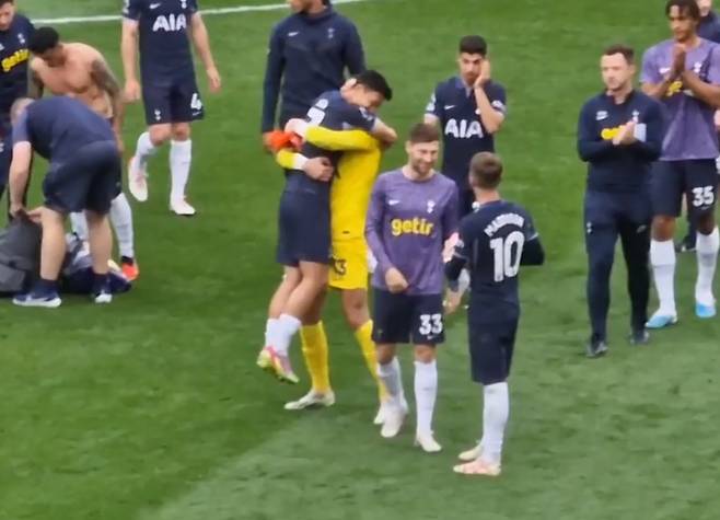 미국 커뮤니티 '레딧'에 올라온 한 영상에 따르면, 토트넘 선수들이 경기가 끝난 후 그라운드에 모여 팬들에게 인사를 하고 있는 가운데 골키퍼 굴리엘모 비카리오가 손흥민에게 다가가 포옹을 한 채 번쩍 들어 올리는 장면이 포착됐다.