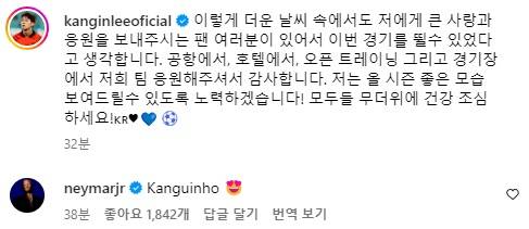 지금은 사우디아라비아 알 힐랄로 떠난 브라질 축구스타 네이마르도 PSG(파리 생제르맹)에 있었을 때, 지난달 3일 부산아시아드 주경기장에서 열린 PSG와 전북 현대의 쿠팡플레이 시리즈 마지막 친선 경기 이후 이강인 SNS에 댓글로 '캉지뉴(Kanguinho)'라고 작성해서 화제가 된 적이 있다.